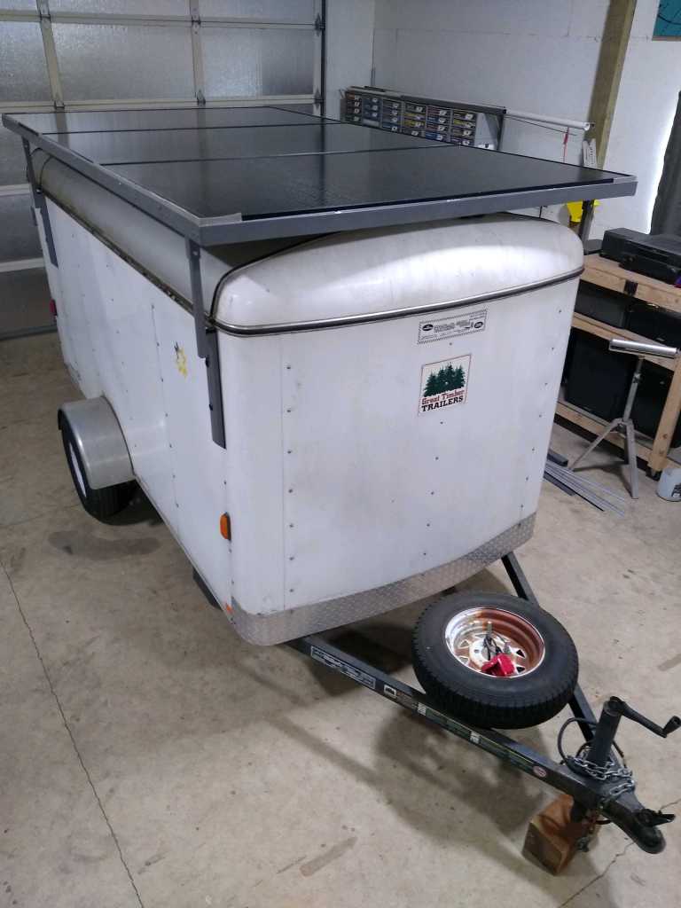 Progress continues on the solar trailer: the roof-rack frame for the 3 solar panels has been fabricated, panels installed, and test-mounted on top of trailer, making available over 1000 Watts under ideal conditions.